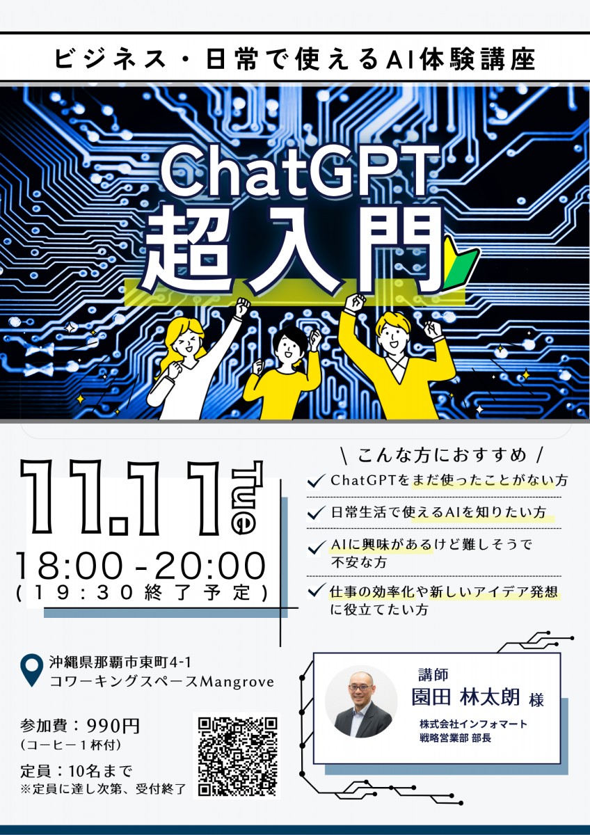開催内容:ChatGPT超入門 ─ ビジネス・日常で使えるAI体験講座 開催日程:11月11日(火) 開催時間:18:00〜19:30(受付開始 17:30〜) 開催場所:コワーキングスペースMangrove (沖縄県那覇市東町4番1号 沖縄セルラーフォレストビル2階) ゆいレール「旭橋駅」徒歩2分 ※お車でお越しの方は近隣コインパーキングをご利用ください 参加費用:990円(税込) 参加人数:10名まで ※定員に達し次第、受付終了となります 持ち物:スマートフォン、PCまたはタブレット端末 申込方法:下記の申込みフォームよりお申し込みくださいませ ※後日、入館用QRコードをメールにて送付いたします