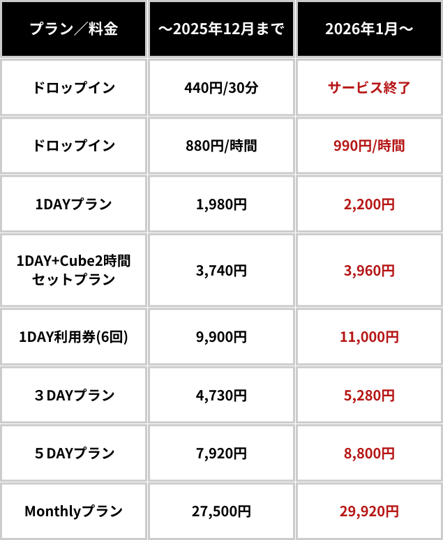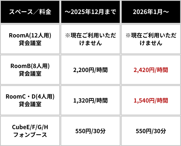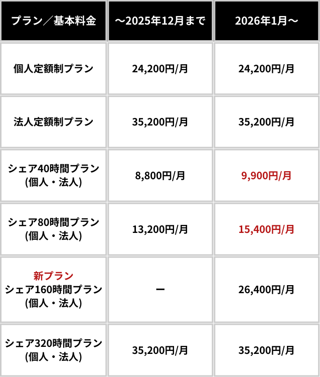 このたび一部の利用スペースの料金変更と新たな月額プランをご用意しました。